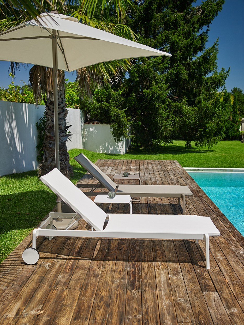 Stackable sun lounger with wheels. Laquered aluminum structure.