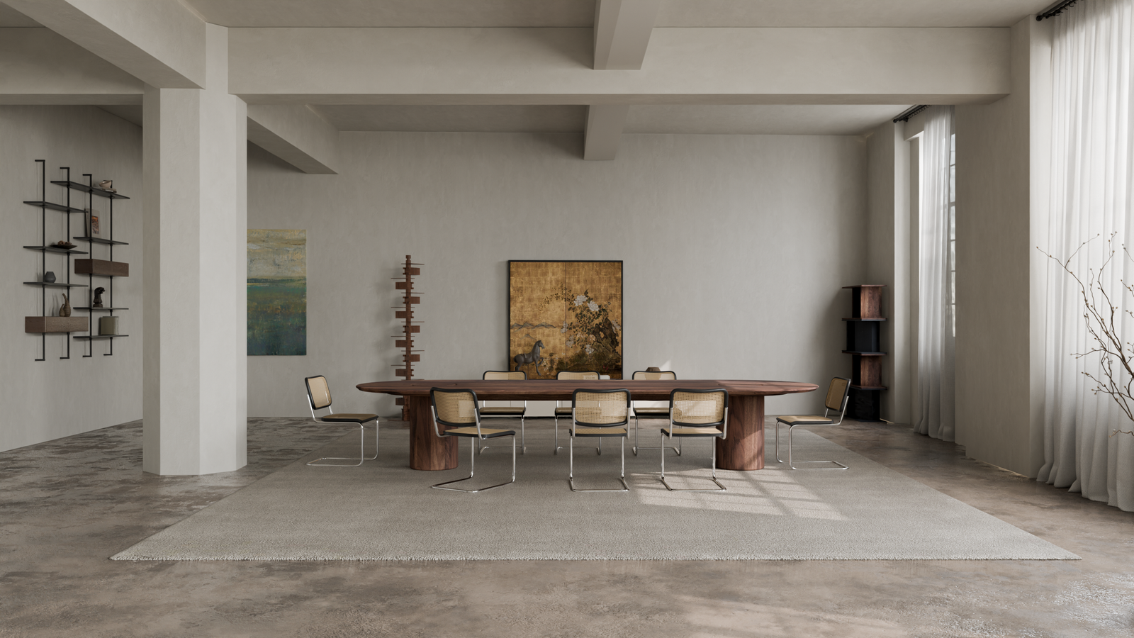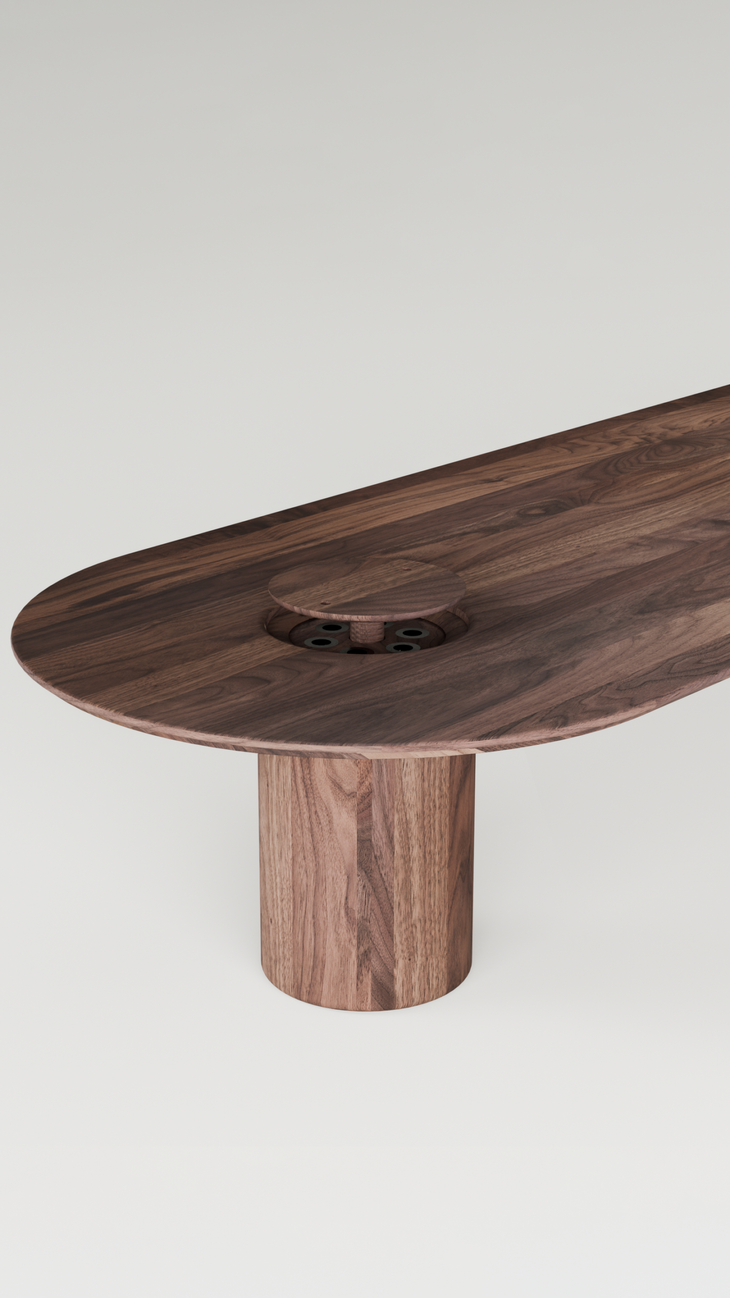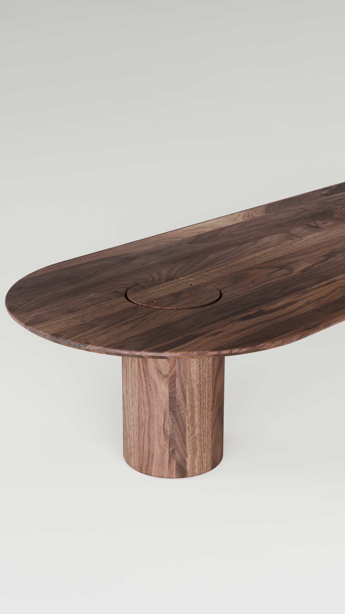 presence. The five-meter tabletop, 140 cm wide, is 38 mm thick and deepens to 76 mm above