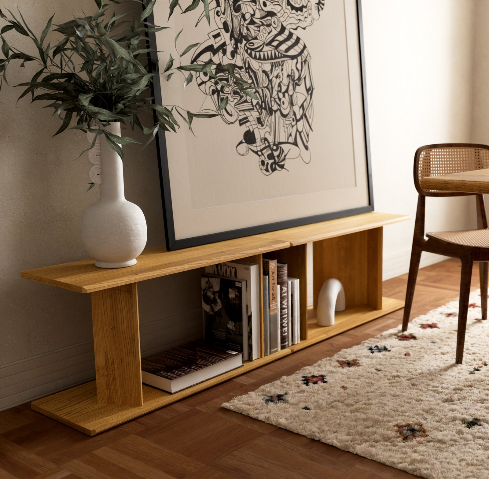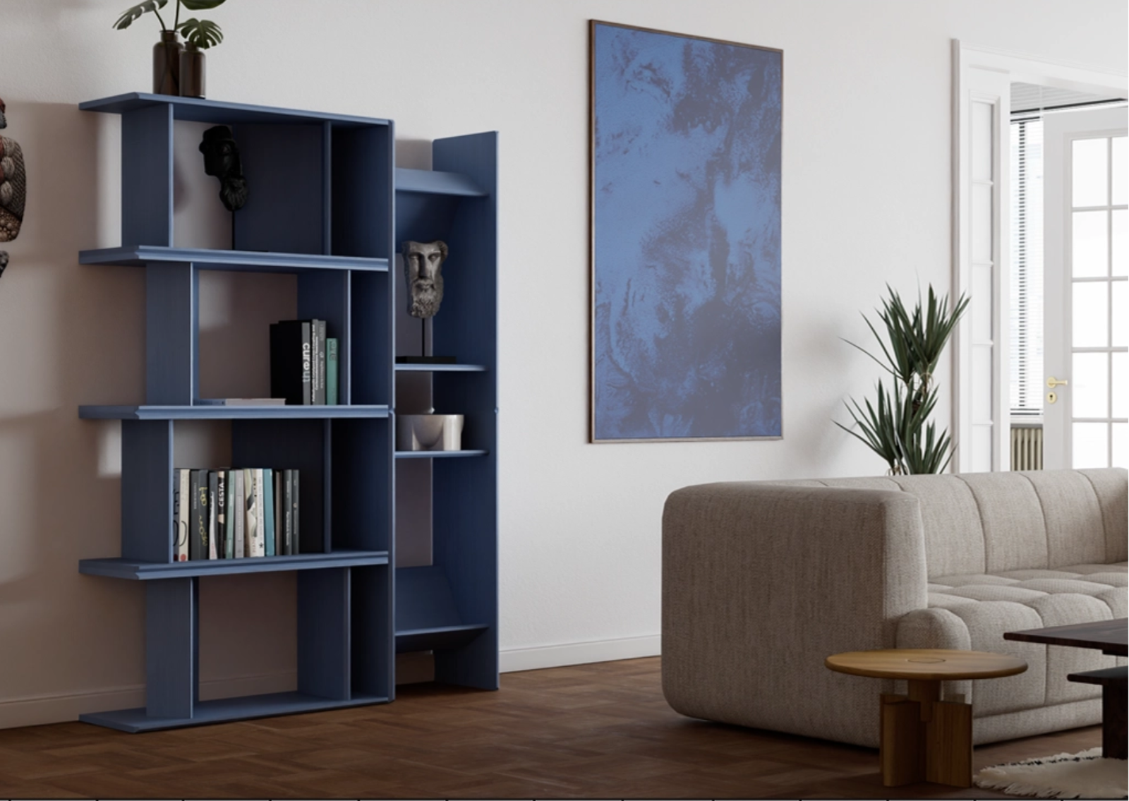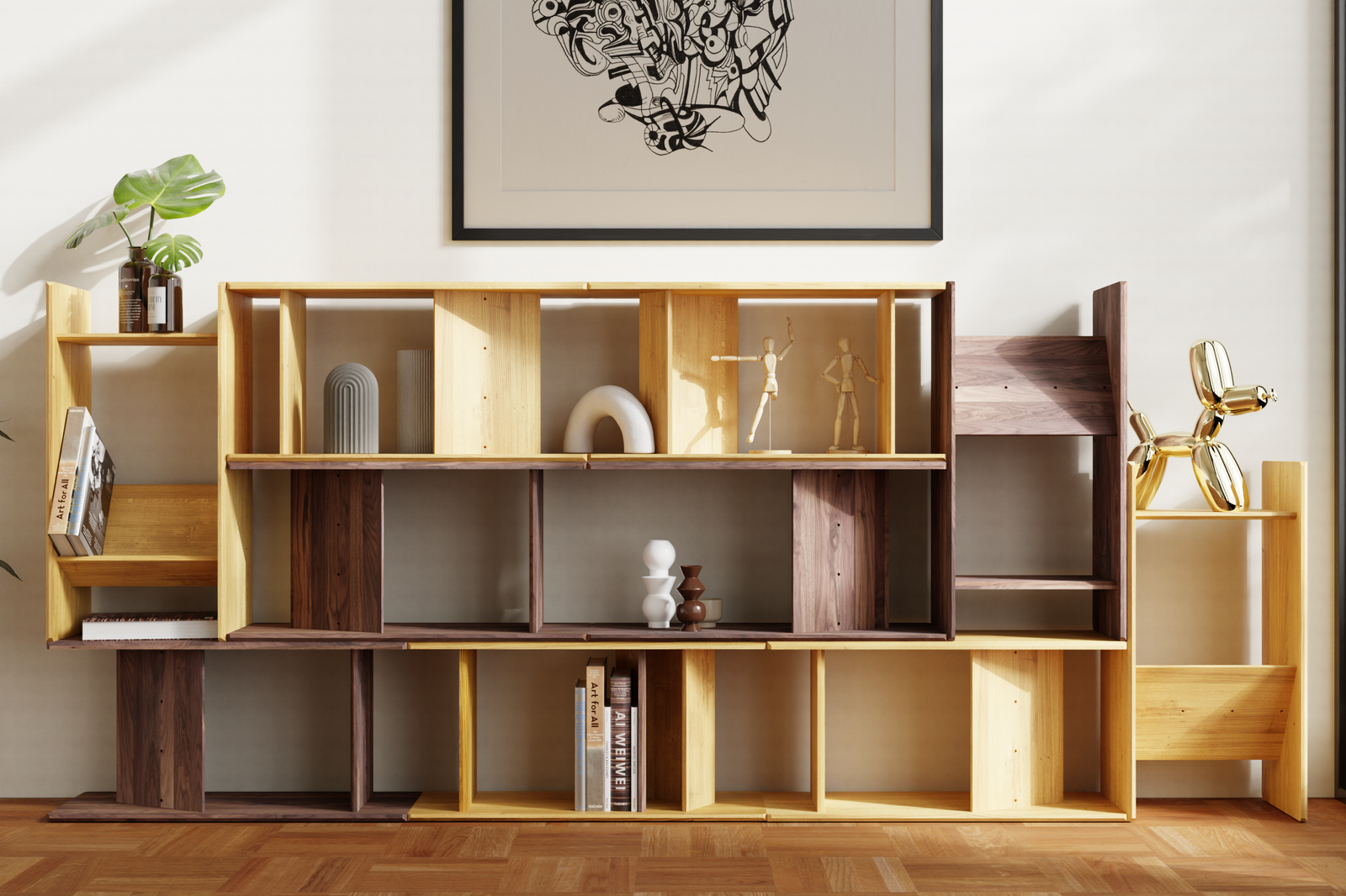 from compact shelving to extended spatial compositions.