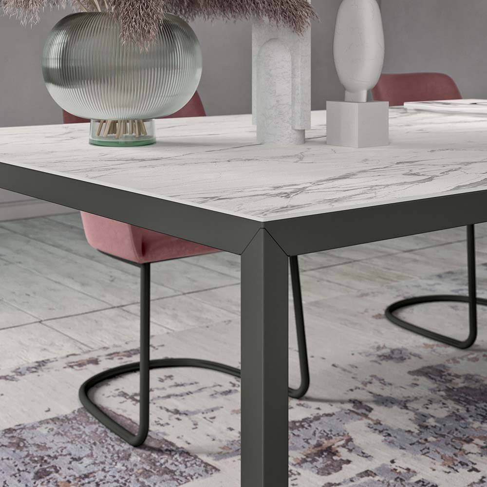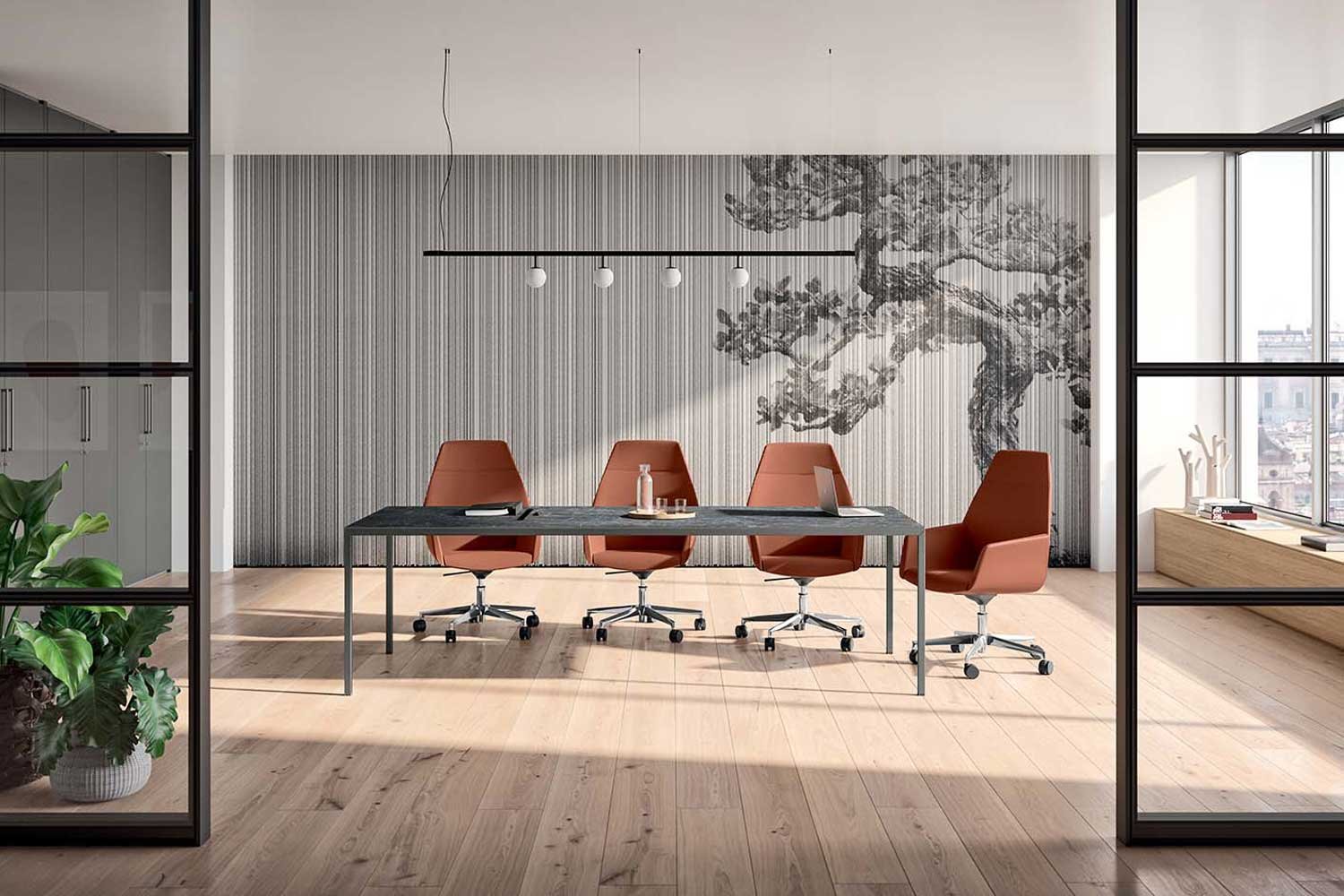 The X6 Table stands out with its unique single-jointed clamp design, which effortlessly fuses a sleek thin tabletop with a strong, stable base, creating a visually stunning piece of furniture. Available in a range of luxurious, customizable finishes—such as elegant porcelain stoneware—and paired with metal sheet legs, this table brings a modern yet timeless aesthetic to your office environment.